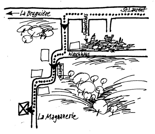 F30580 Fontareeches / France Autobahn A7 Lyon-Orange, Ausfahrt Bollene. Dann Richtung Bagnols, nach Bagnols Richtung Ales, etwa 15 km nach Bagnols links auf die D23 Richtung Uzes abbiegen. In St. Laurent la Vernede nach rechts Richtung Fontareches. Dann vergleiche Plan (siehes rechts). |